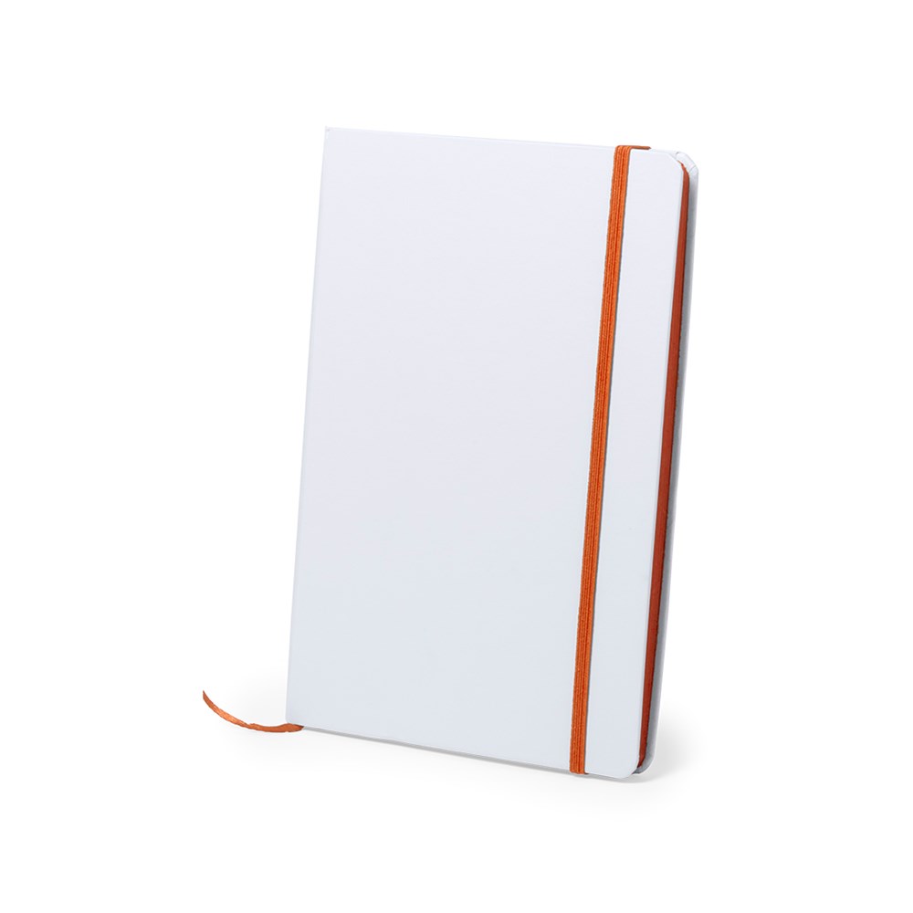Notepad with rigid soft-touch covers in white. 100 plain sheets with side in fun colors, elastic band and matching color fabric bookmark.
