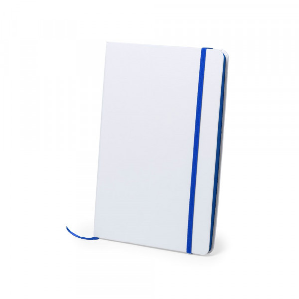 Notepad with rigid soft-touch covers in white. 100 plain sheets with side in fun colors, elastic band and matching color fabric bookmark.