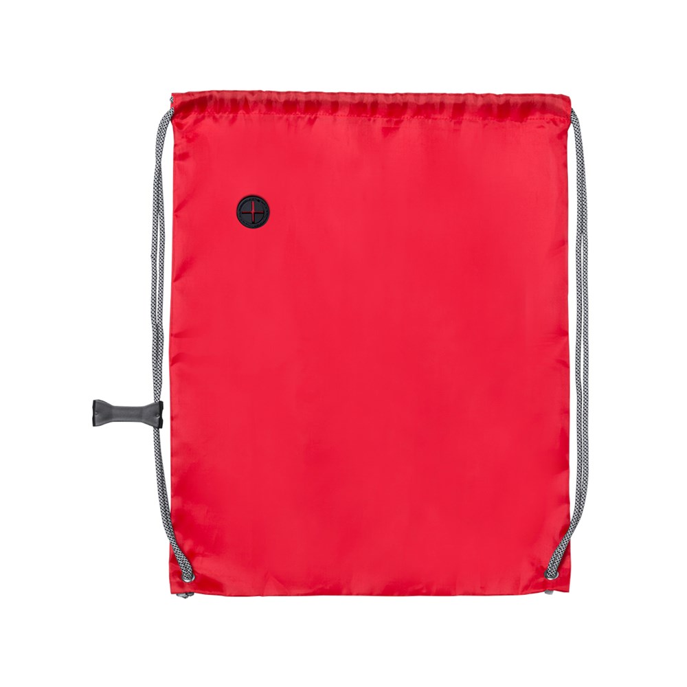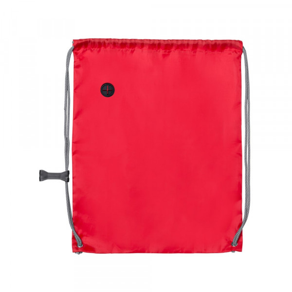 Drawstring backpack in soft polyester 190T in bright tones. With headphones outlet, with extra thick, grey color, self closing strings. With adjustment accessory and corners with metal eyelets and reinforcement.