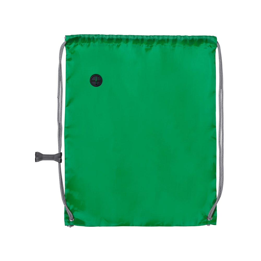 Drawstring backpack in soft polyester 190T in bright tones. With headphones outlet, with extra thick, grey color, self closing strings. With adjustment accessory and corners with metal eyelets and reinforcement.