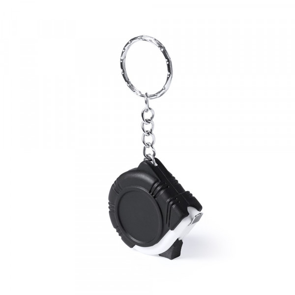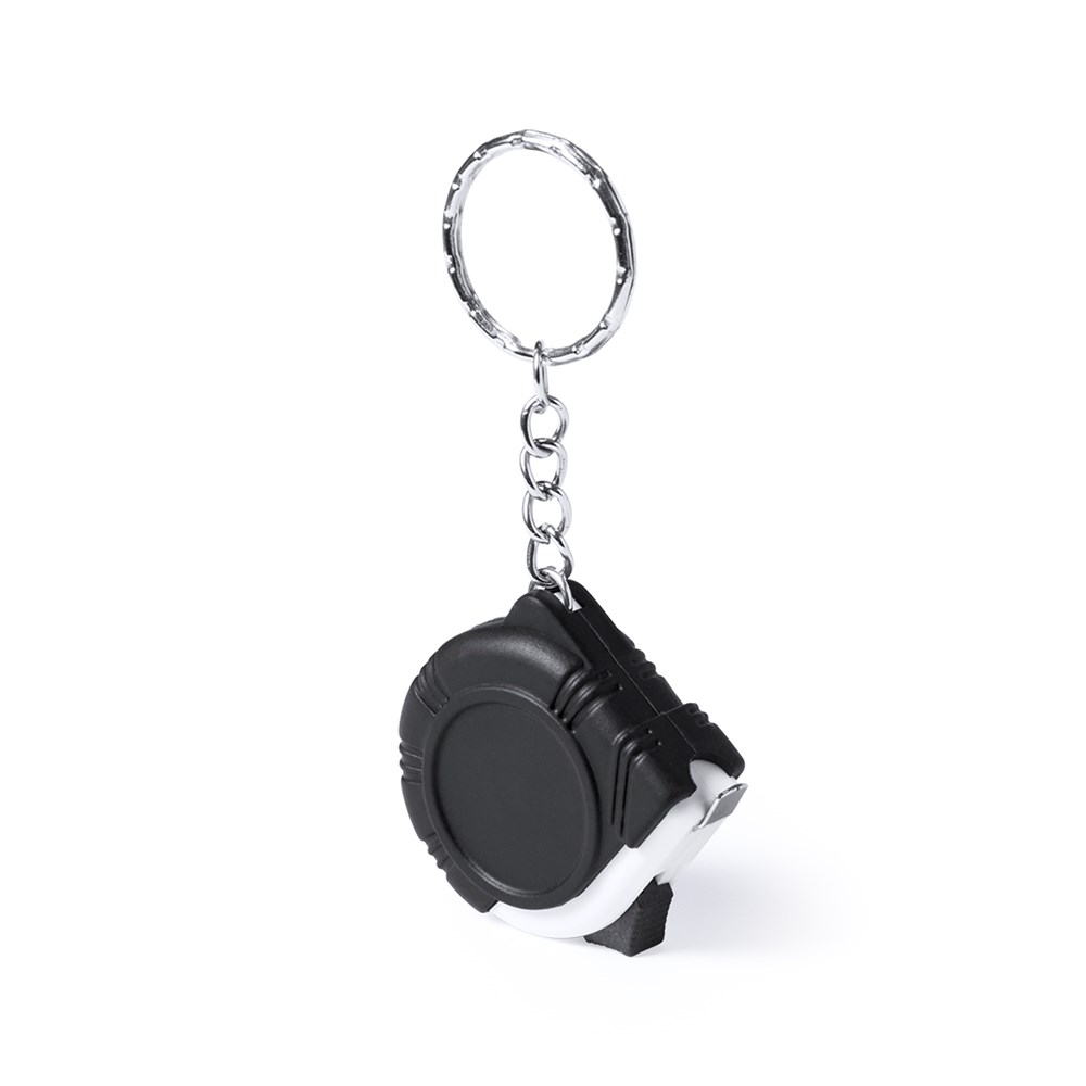 1 metre keychain flexometer with metal blade and locking mechanism. Measuring system in centimeters, inches and feet. With special die-cut for printing.