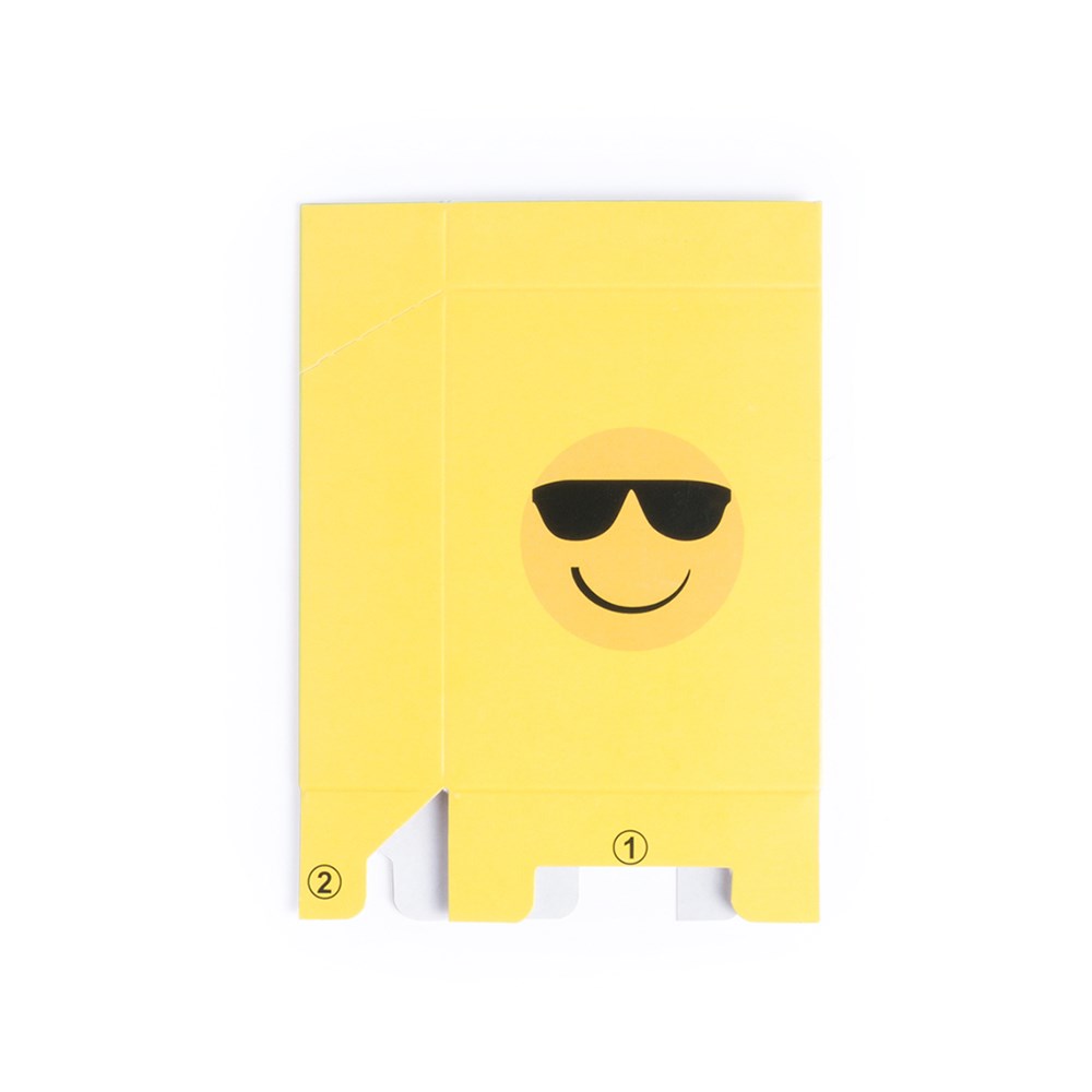 Cigarette box case in fun emoji designs. In eye-catching yellow color. Glossy cardboard with emoji on the back and folded presentation.