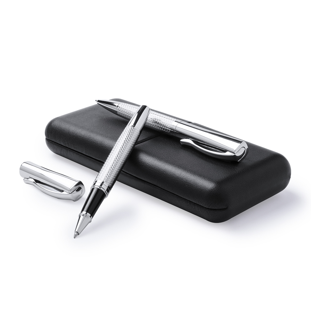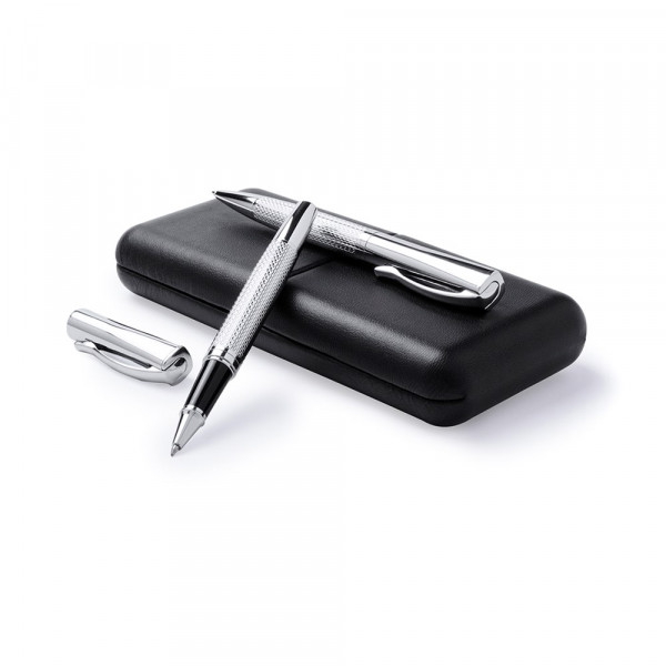 Elegant set of ball pen with twist mechanism and hooded roller hood in sober design. Non-slip metal body in shiny silver finish with matching color clip. Presented in an elegant and original individual black PU leather case with a die-cut inside in soft white velvet. Jumbo cartridge with German quality blue ink.