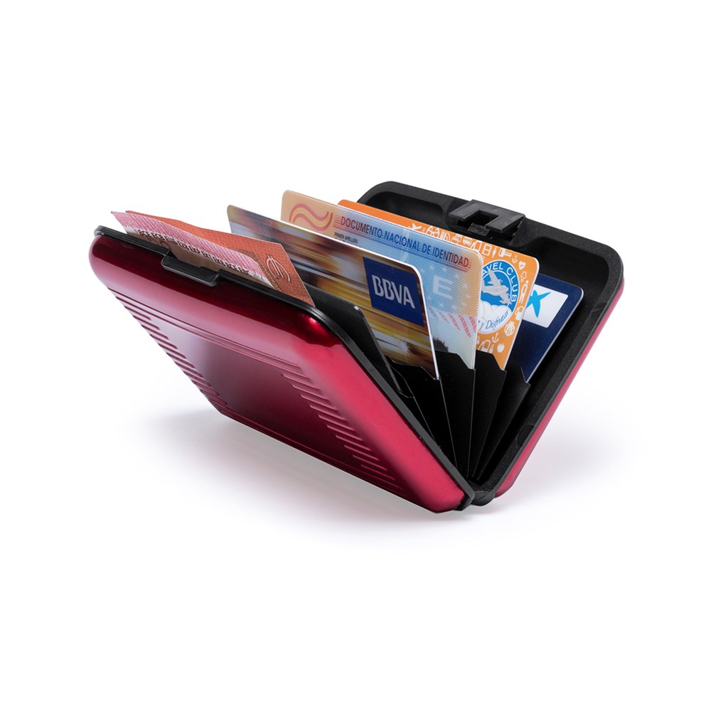 Card holder with RFID (Radio Frequency Identification) security technology that keeps card data safe. Resistant aluminum design, with 6 compartments and plain area on the outside designed for laser printing.