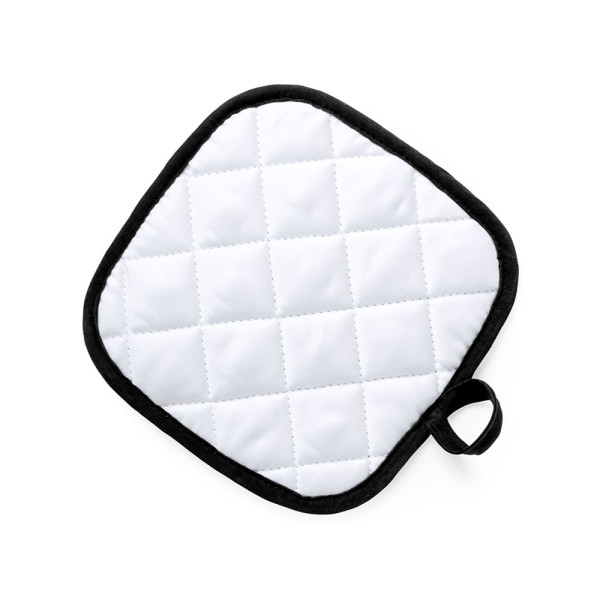 Kitchen grip in soft 100% polyester material with soft white finishing and bright toneed piping. With a plain side especially designed for sublimation and hanging ribbon.