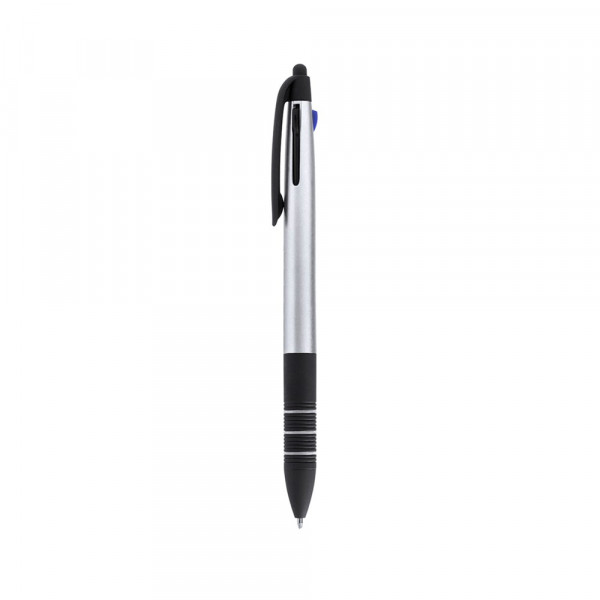 Pointer ball pen 3-in-1 retractable pushbutton mechanism, modern design and body with smooth metallic finish in vivid colors. With black details and soft ergonomic grip in black with matching color rings. 3 cartridges in blue, red and black ink.