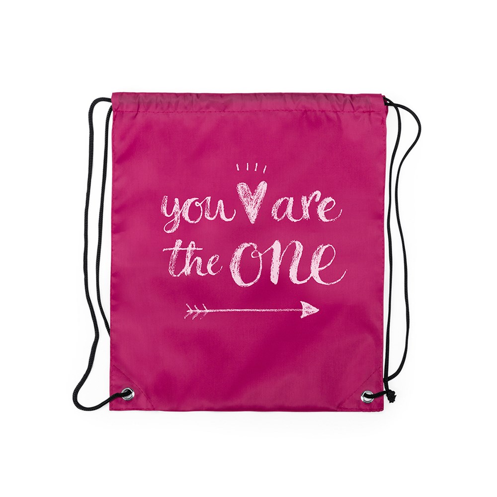Drawstring backpack for children in soft polyester 210D and in bright tones. With black self closing strings and corners with metal reinforcement eyelets.