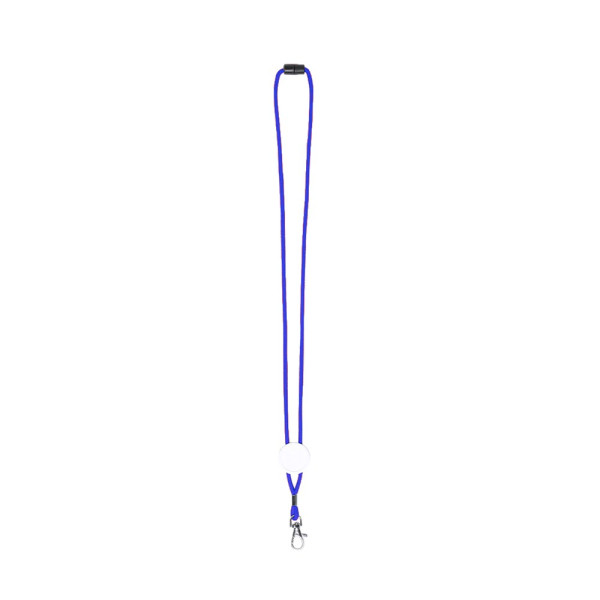 Lanyard in resistant and soft polyester string in a varied range of bright tones. With detachable snap closure on collar, metal carabiner accessory and central pad for printing.