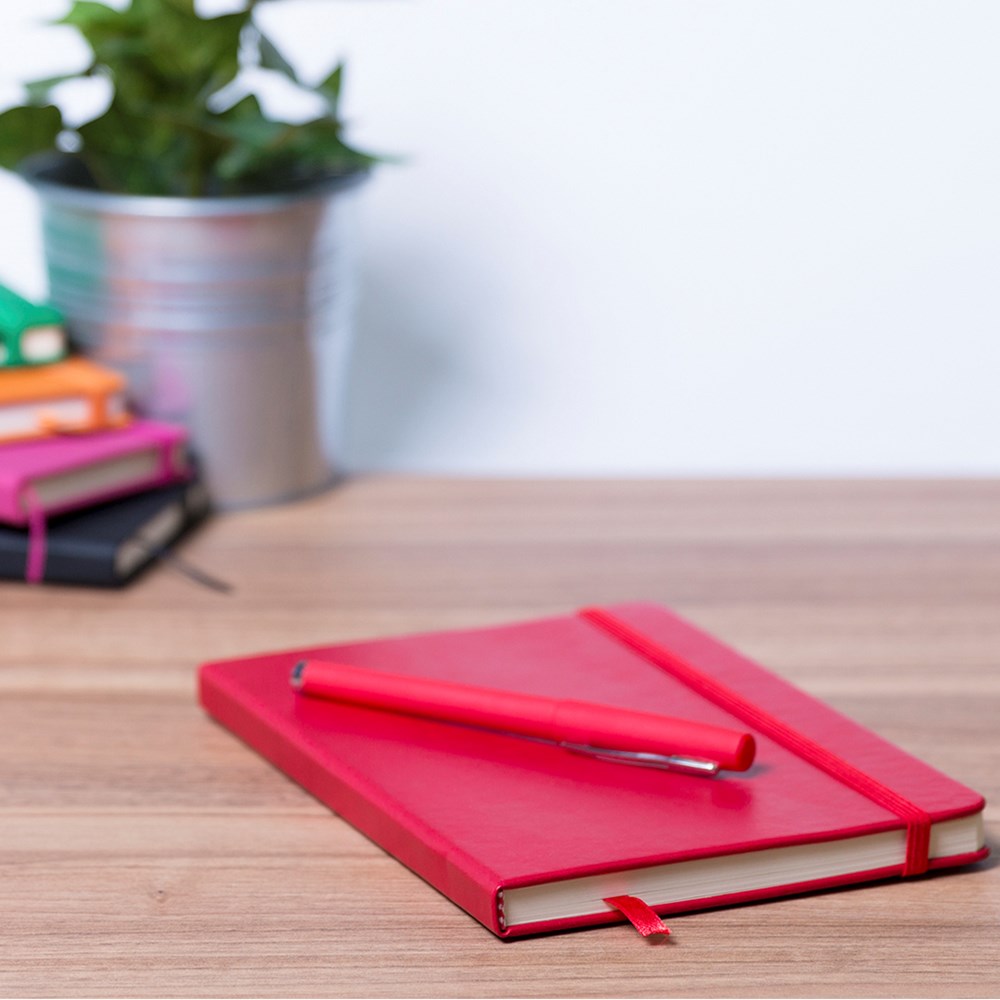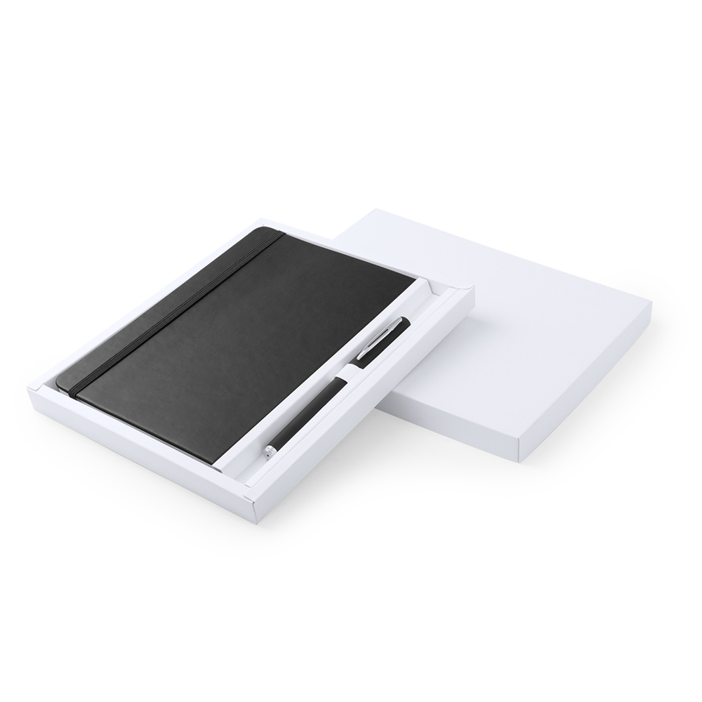 Notepad set with soft-touch covers in PU leather and matching color soft body pen. 100 blank sheets with elastic support and matching color fabric bookmark. Presented in an elegant white die-cut cardboard box. Ball pen with blue ink.