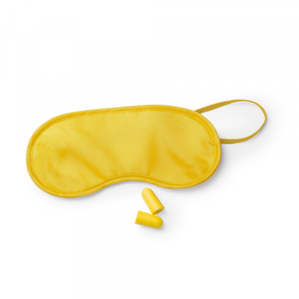 Travel set of mask and earplugs. Mask in soft and comfortable microfiber of vivid colors with elastic adjustment in matching color. Pair of earplugs in comfortable EVA material. Presented in an individual bag.