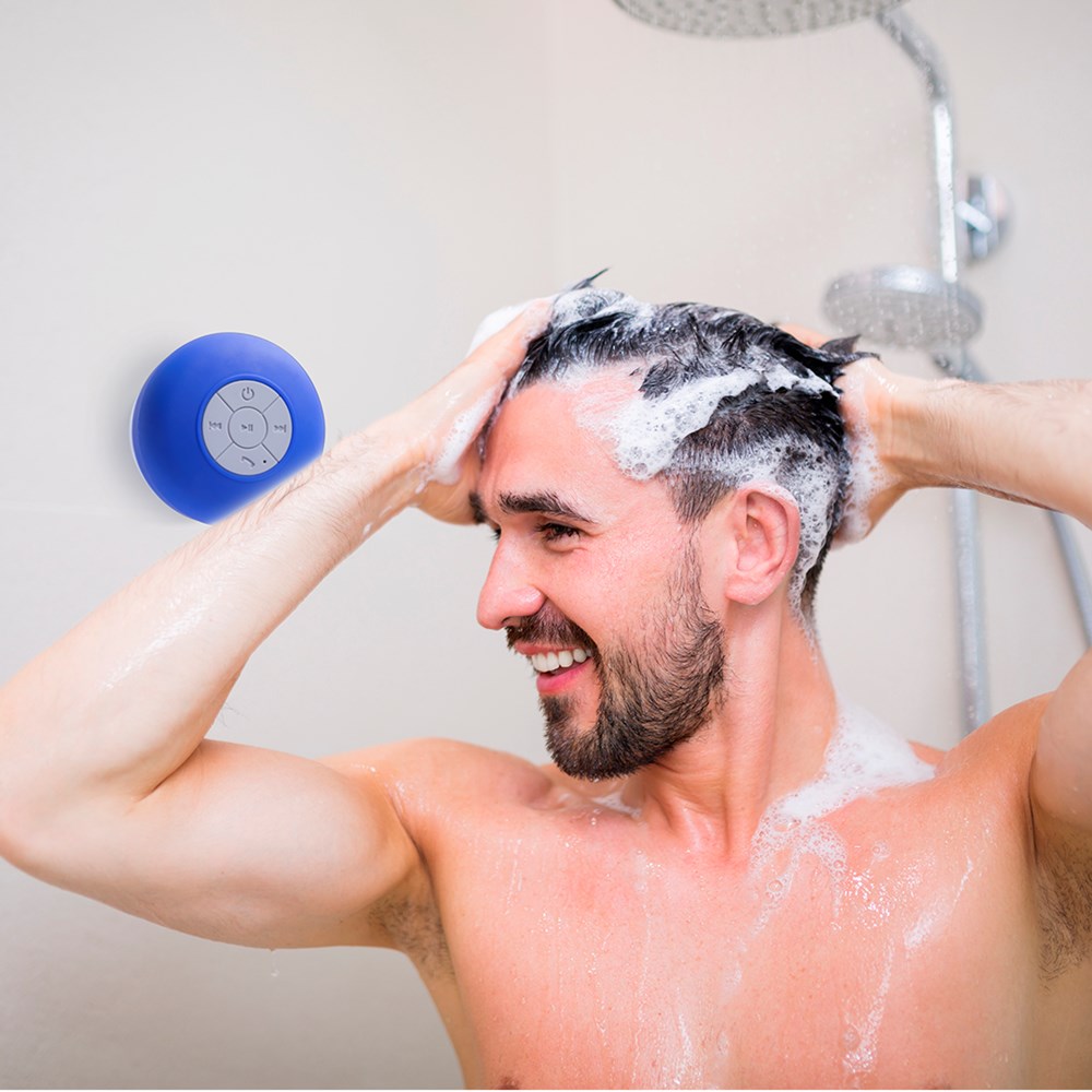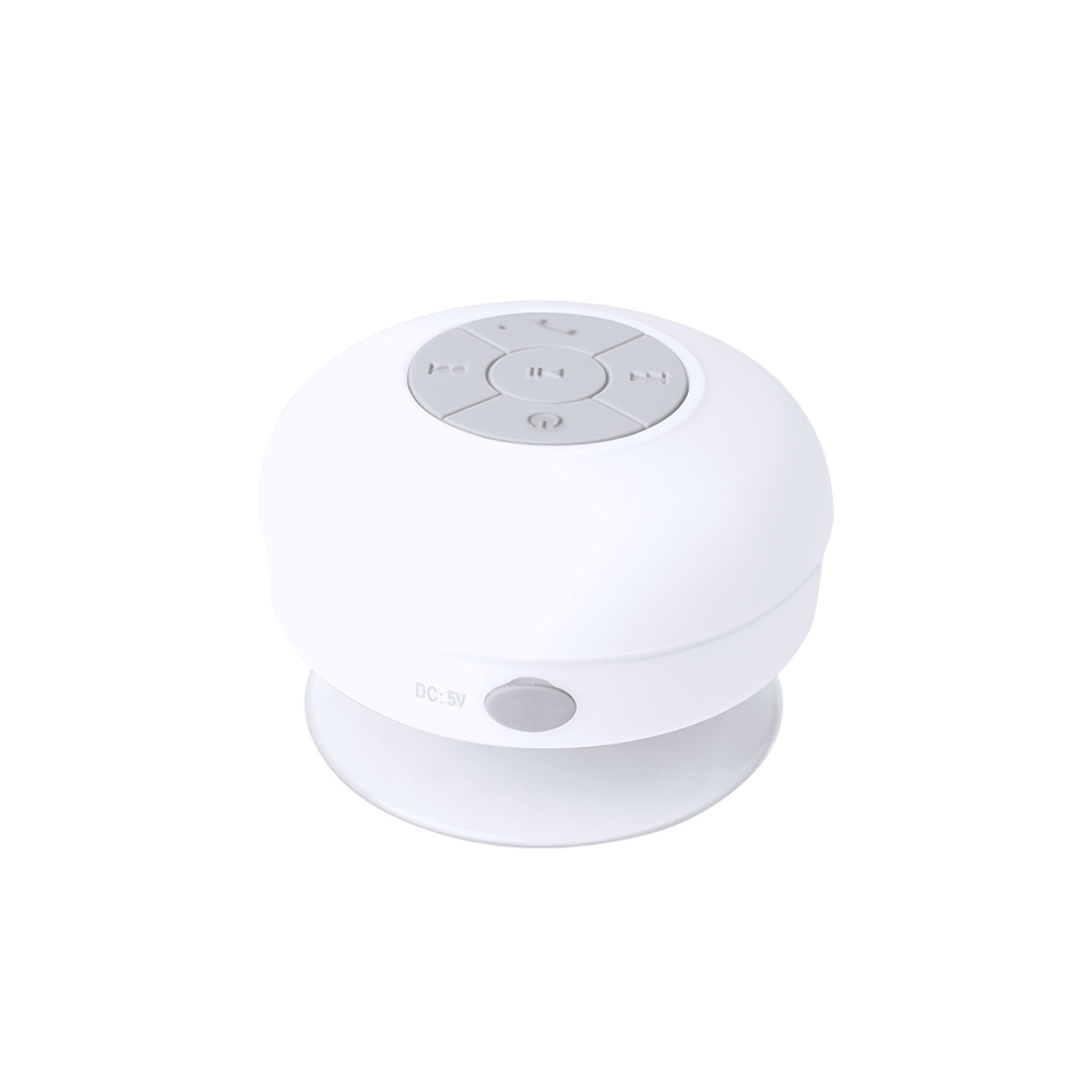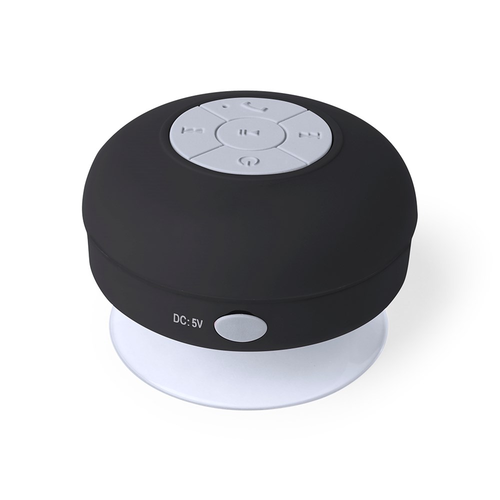 Speaker with Bluetooth® 5.0 connection and 3W of power. Rubber touch and splash water resistant, with high adherence silicone suction cup on the base. Hands-free function, with charging cable included, compatible with iOS and Android. Presented in an attractive design box, with instruction manual in English and Spanish. Available in a wide range of colours.