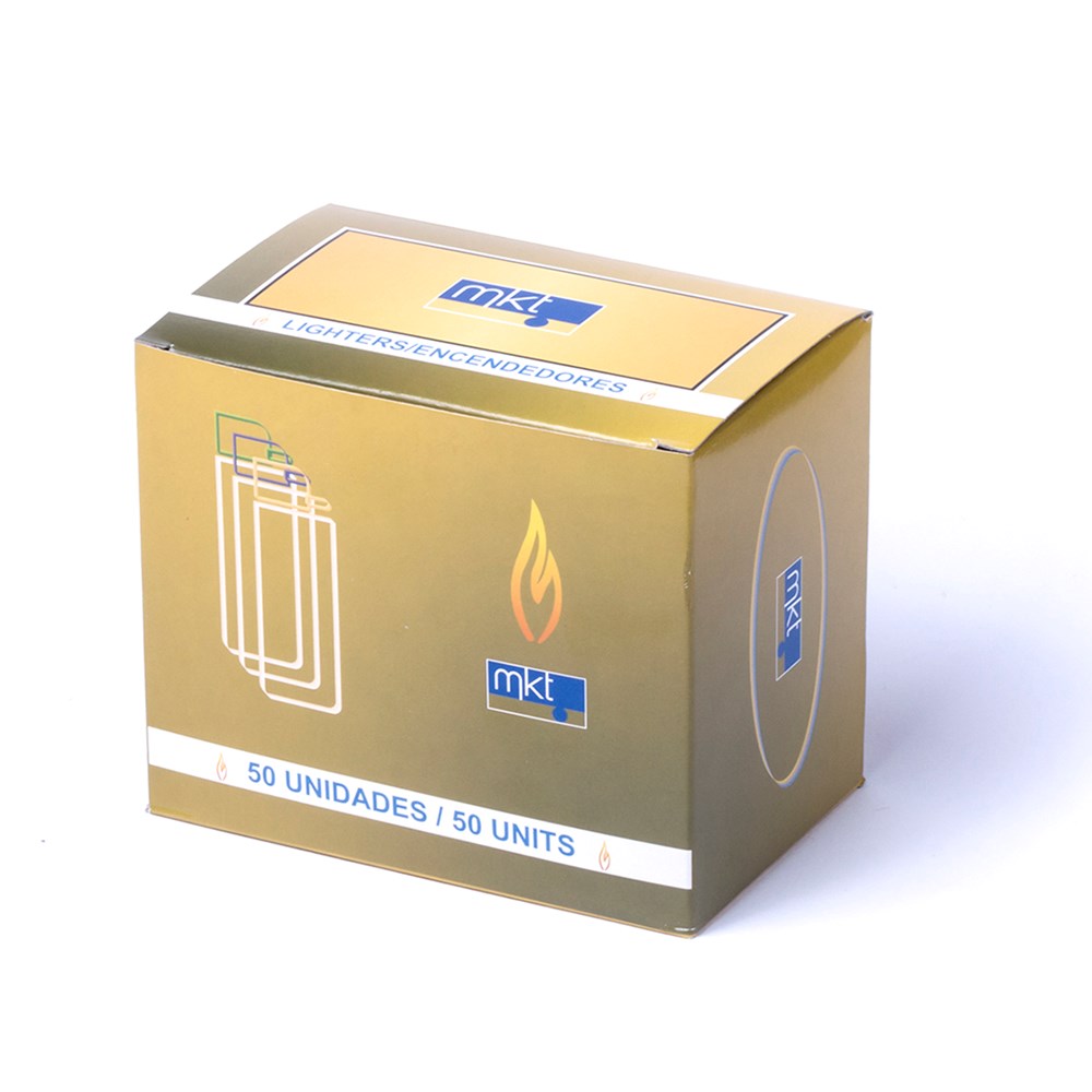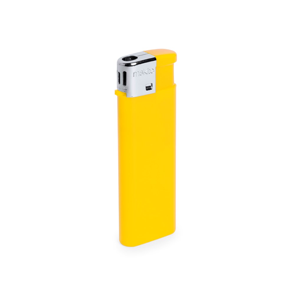 Gas lighter with electric mechanism. With child protection, refillable, flame regulator and available in a wide range of solid colours. Supplied in boxes of 50 units of the same color.