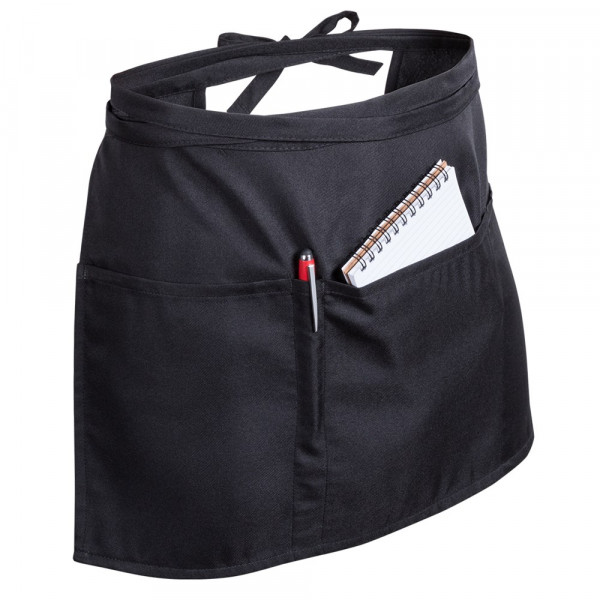 Apron for waist in 100% polyester material, smooth finish in an elegant black. With 2 large pockets, one medium pocket and pen holder. Adjustable by straps.
