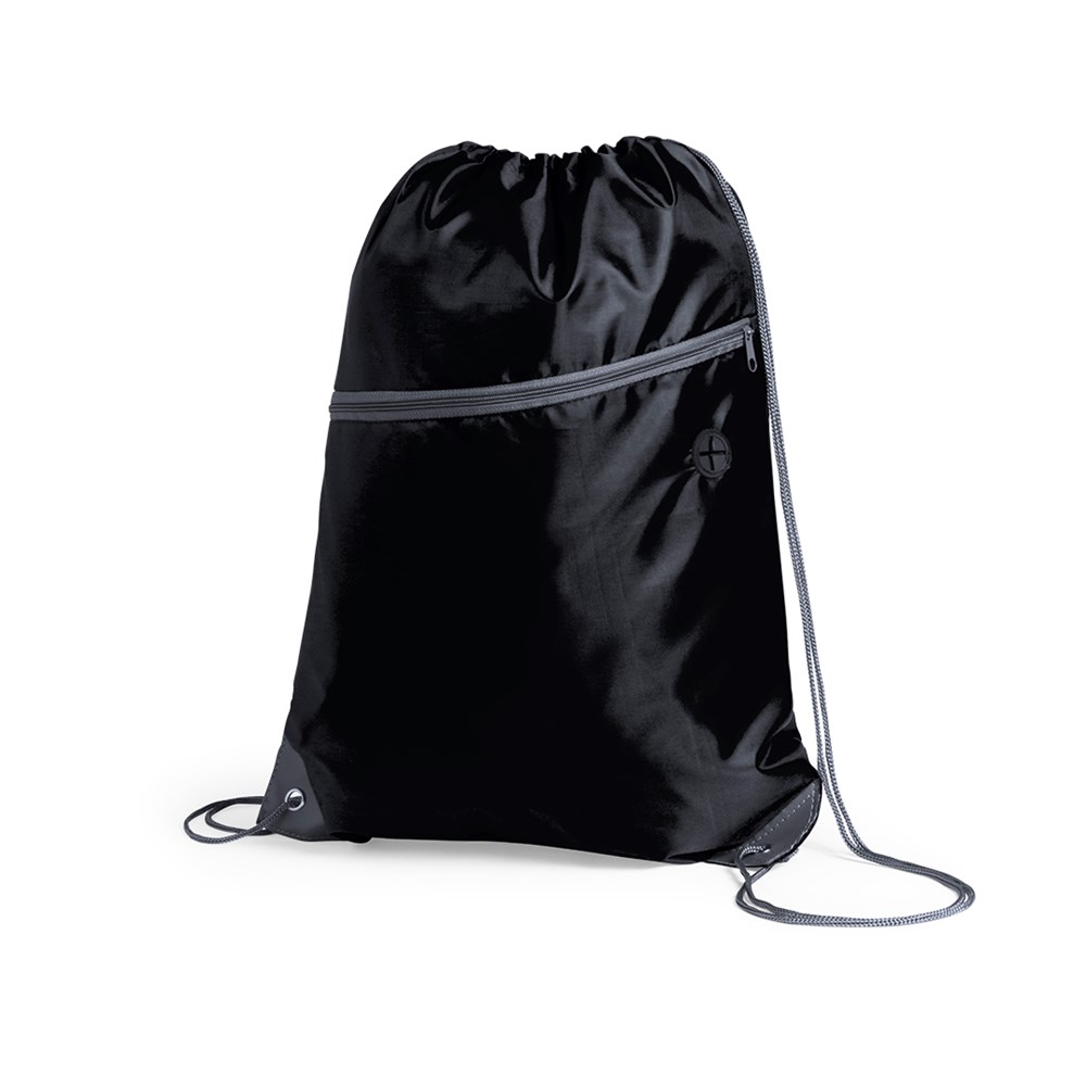 Drawstring backpack made of soft 210D polyester. With front zipped pocket and headphone outlet. Self-closing strings in grey colour, matching zip and corners with metal eyelets and PU leather reinforcement. Avaiable in a wide range of colours.