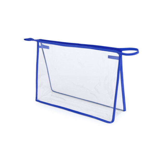 Multi purpose beauty bag in resistant transparent PVC with reinforcement edges in bright tones. With zipper and matching color carrying handle.
