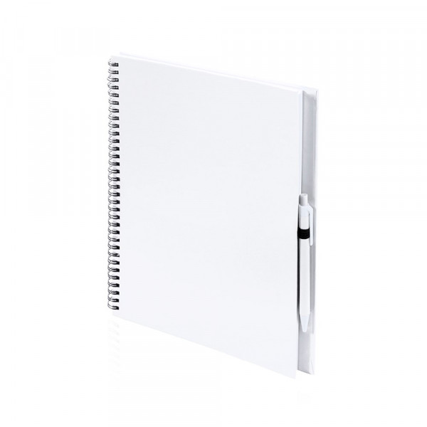 Ring notebook with soft-touch covers in resistant recycled cardboard and ball pen in matching color recycled cardboard. Bold colors, 80 blank sheets and ball pen holder on back cover.