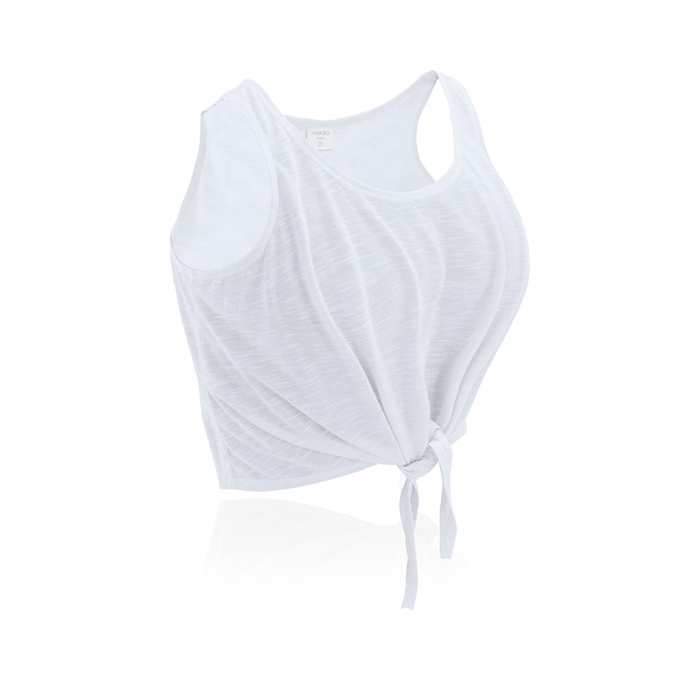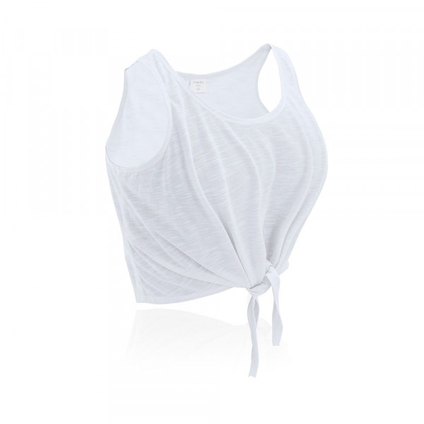 T-shirt for girl in soft polyester 130g/m2. With tie rod design and with knot front closure. Available in white and a wide range of bright fluorescent colors. Sizes S, M, L.