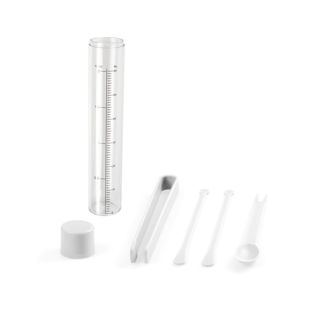 Set for cocktails with 5 accessories in a wide range of bright tones. Includes measuring container of 60ml capacity, carving spoon, tongs and two agitators.