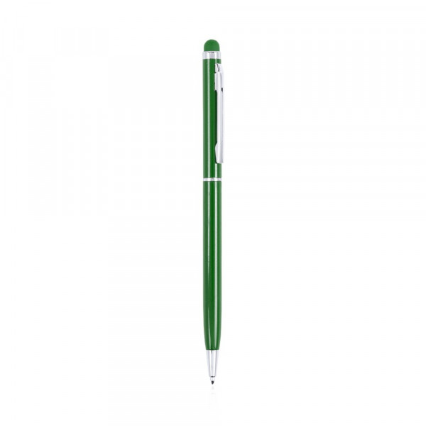 Pointer ball pen with twist mechanism and ultra-fine aluminum body in a smooth metallic finish in varied colors and matching color stylus. Details and rings in silver color. Blue ink.
