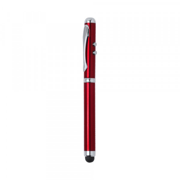 Metal laser pen in an elegant shiny finish, with side activation buttons for laser and light functions (button cells included). Blue ink refill, with integrated touch pointer, hood cap and chrome-plated clip. Specially designed for laser engraving. Presented in an elegant metal case and inside a cardboard box with silver finish. Inside in soft die-cut sponge, with spare cells.
