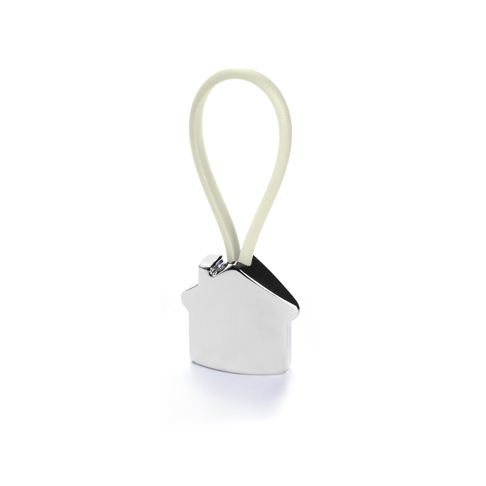 Metal keychain in fun 3D home design. With rubber band in a varied and bright tones.