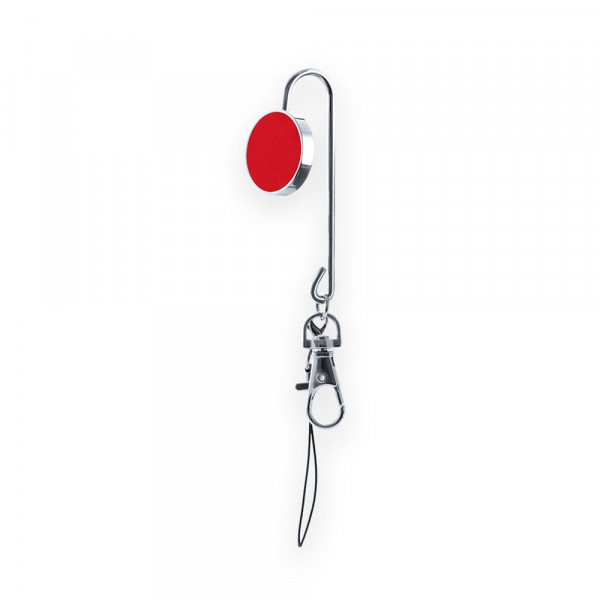 Metal bag hanger keychain with crown in brightly colored PU leather. Carrying belt with carabiner closure. Presented in an individual case.