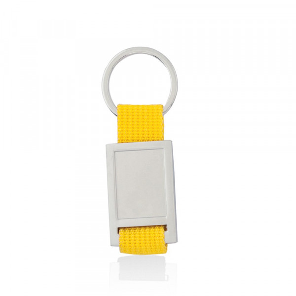 Keychain of fun design with polyester ribbon of varied and bright tones. With die-cut metal body especially designed for doming.