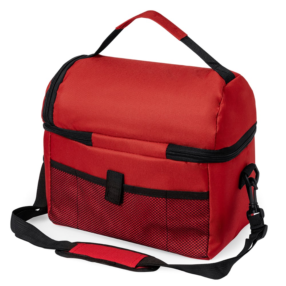 Multi purpose cooler bag in resistant 600D polyester with bright tones and two independent zippered compartments. With 2 front pockets, one of them with velcro closure and elastic mesh pocket at the back. With stretchable shoulder strap with carabiner closure and matching color padded shoulder brace.