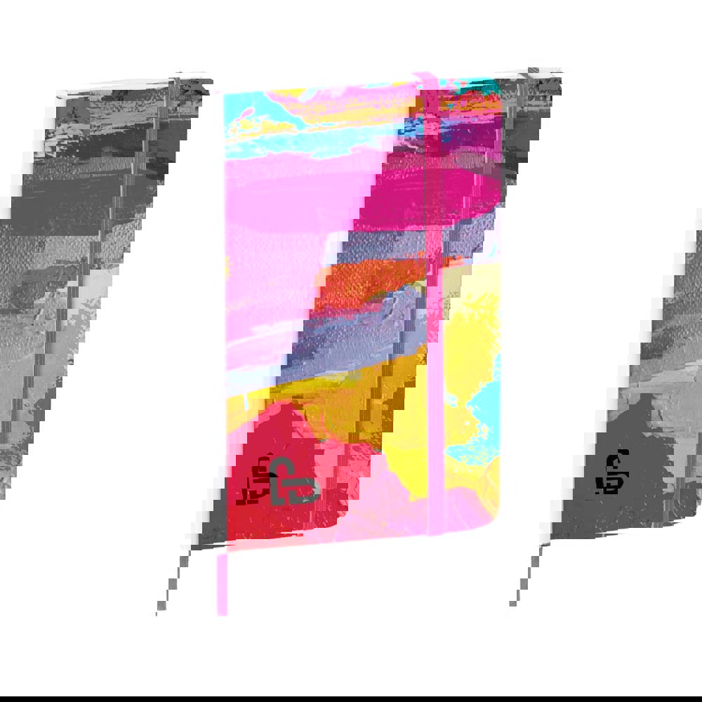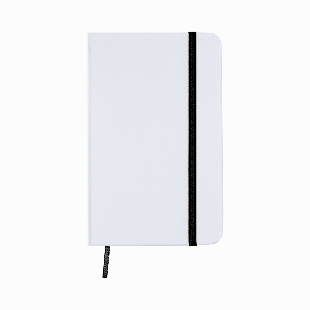 Notepad with soft-touch covers in resistant cardboard with an elegant white finish. especially designed for digital printing on covers, including 80 blank sheets with elastic band and matching color fabric bookmark.