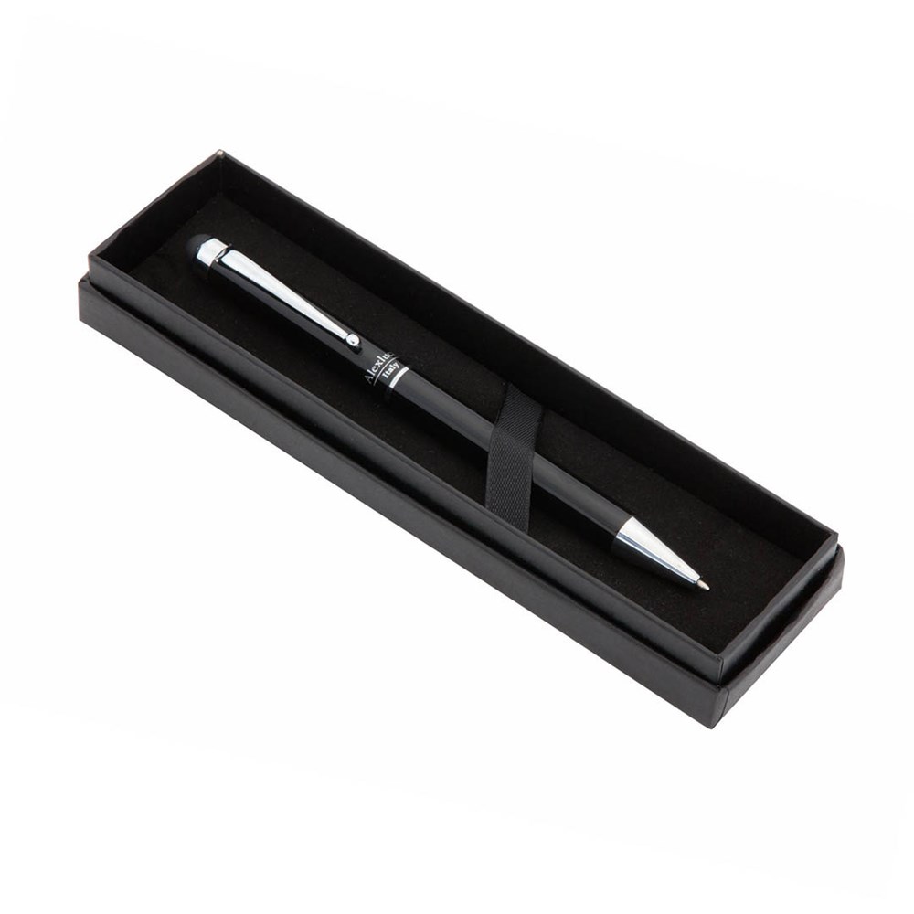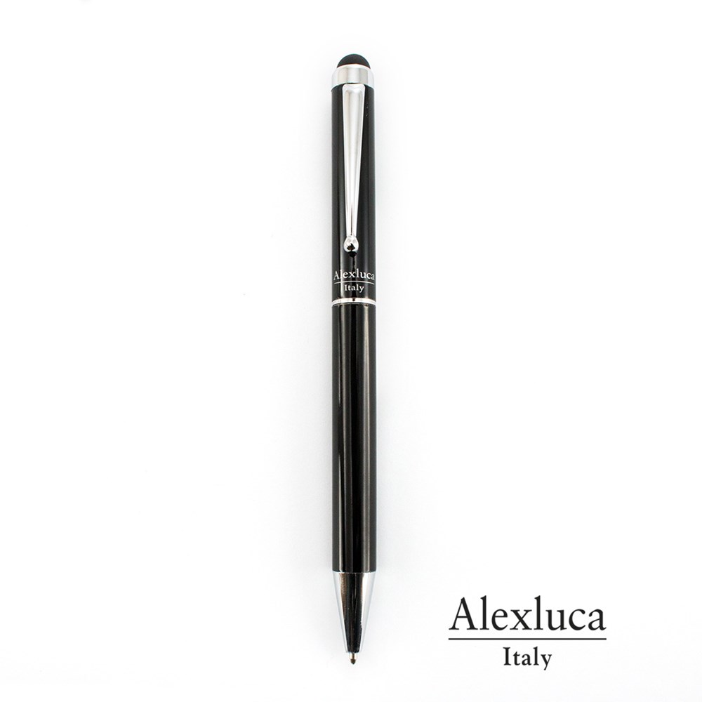 Alexluca ball pen with twist mechanism and smooth metal body in an elegant black color. Clip and design tip in matching color. Presented in an individual black box with the brand logo. Blue ink.