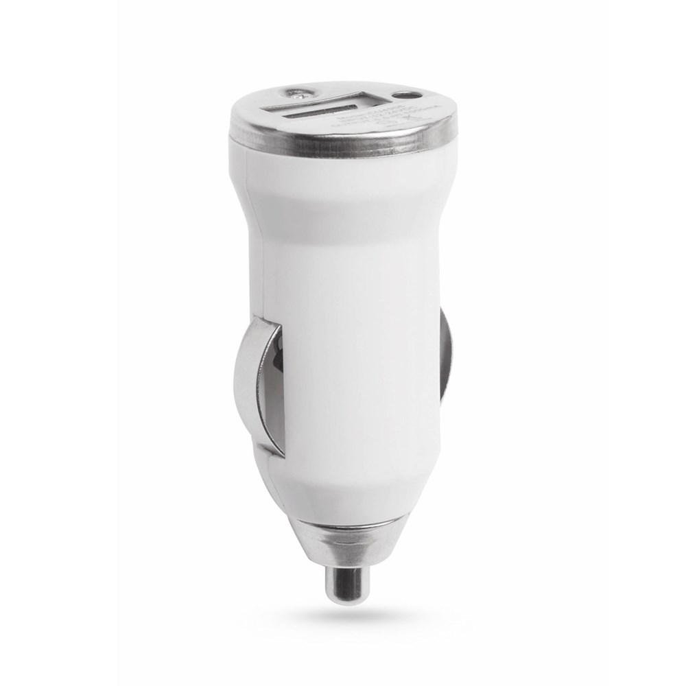 USB charger for car cigarette lighter. 1,000 mA charging capacity in bright tones. Coverin metallic finish with LED charge indicator and presented in an individual box.