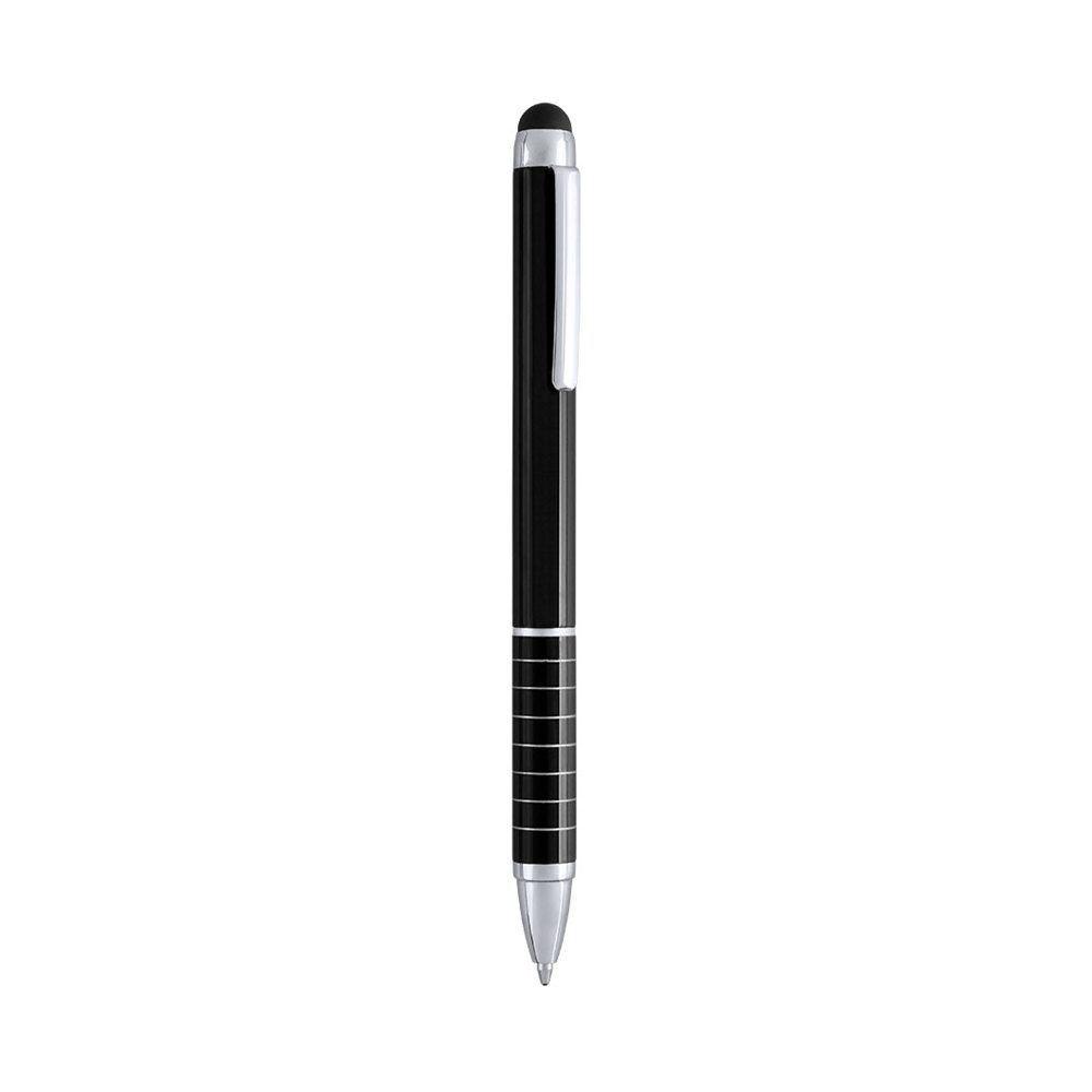 Pointer ball pen with twist mechanism and aluminum body in smooth metallic finish and bright tones. Details and rings in silver color. Original ringed grip and blue ink.
