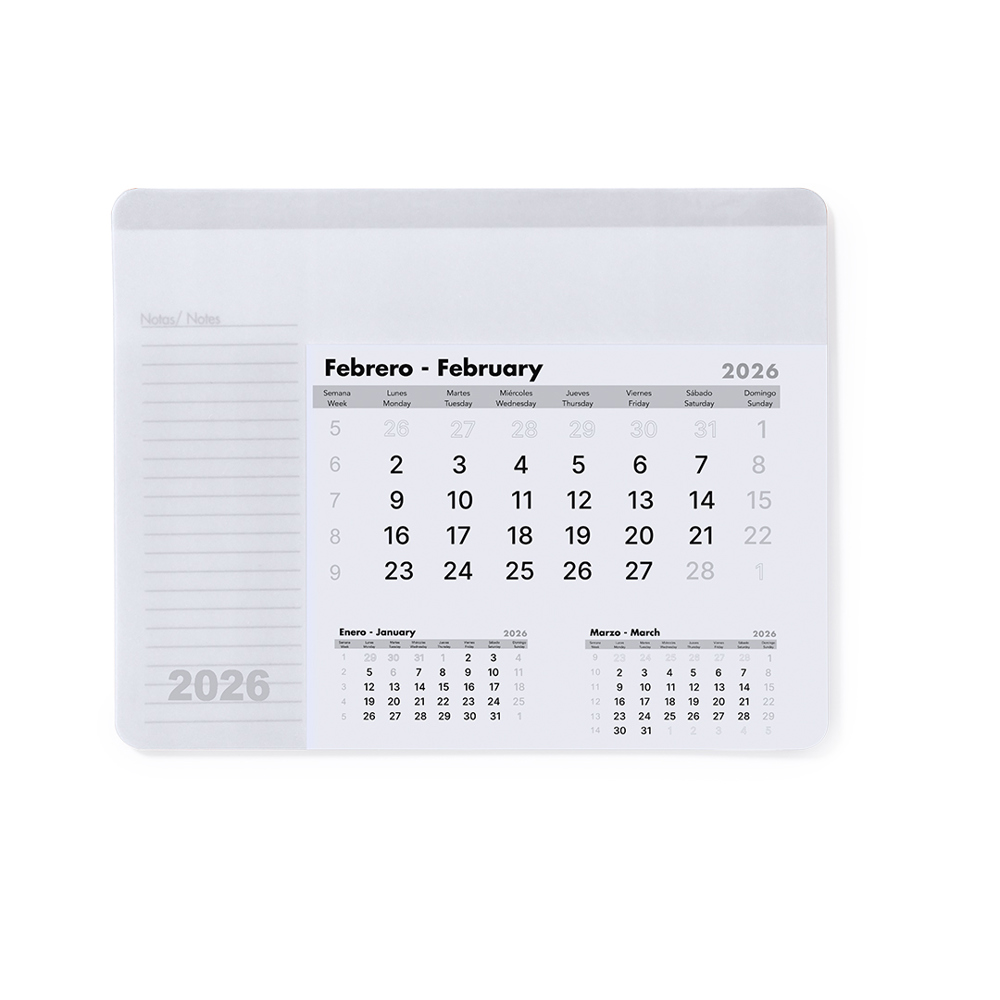 Calendar mousepad with 12 inside sheets. Design current month/previous month/next month, with notes area. Transparent protective cover and non-slip padded base.