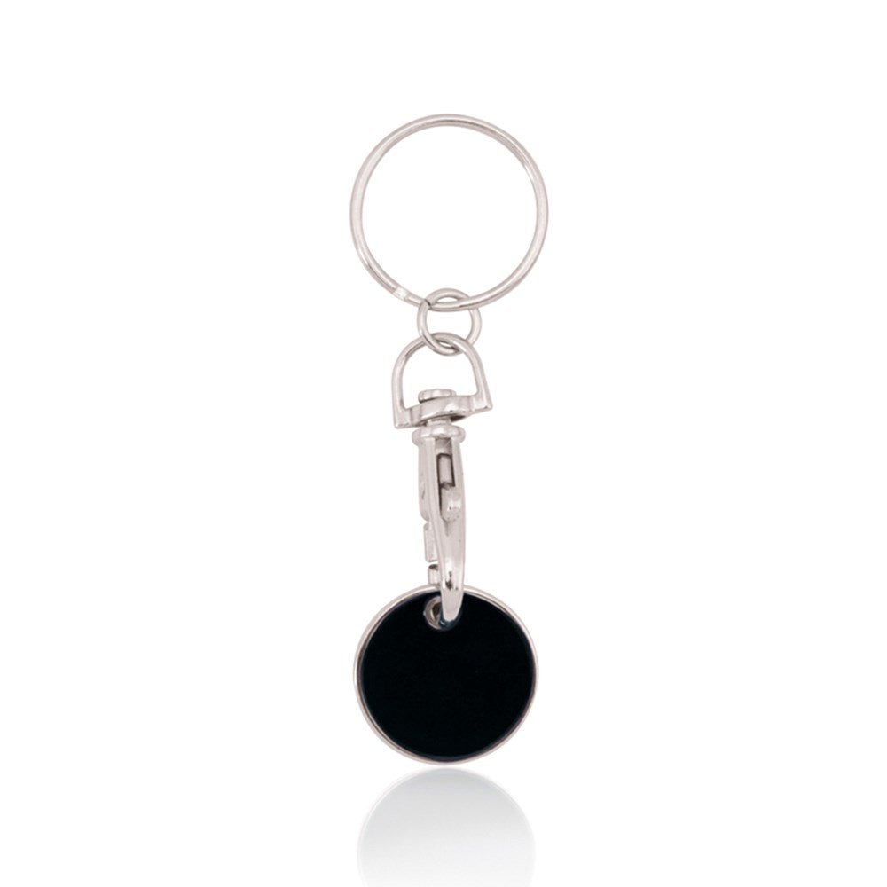 Metallic keychain coin in fun design in varied colors with removable coin and closure carabiner.