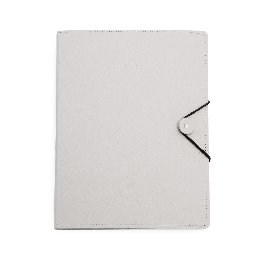 Folder with original elastic band closure, made of resistant recycled cardboard with reinforcement seams. Inside with notepad of 20 sheets and striped layout, triangular flap pocket and pen holder.