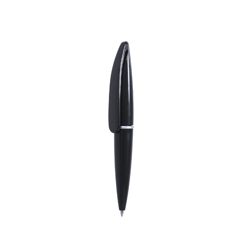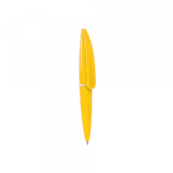 Mini ball pen with twist mechanism in bold solid colors. With original oversized clip and silver colored center ring. Blue ink.
