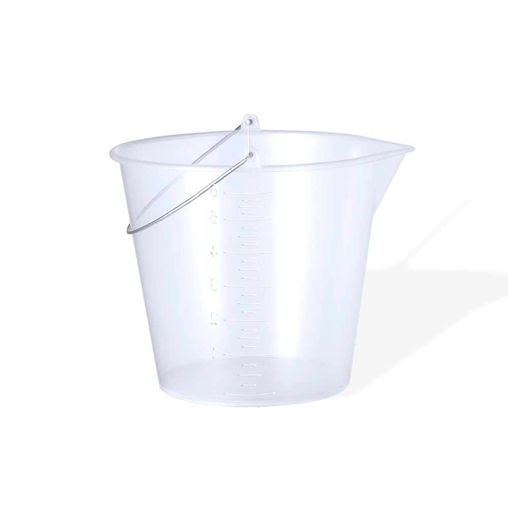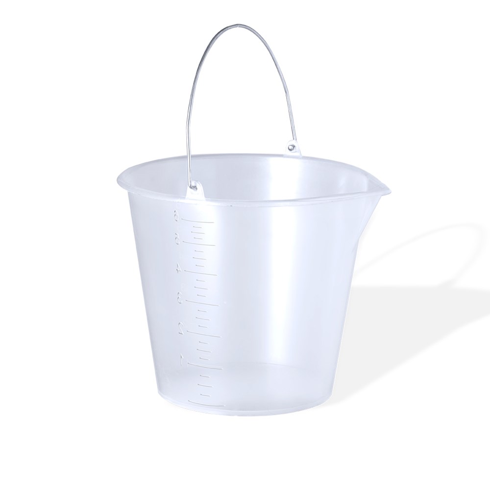 6L bucket made of durable transparent PP. With metal handle and side measuring cup in ml for quick and easy viewing. Rounded contour with pour spout to prevent spillage, plus a large branding area.