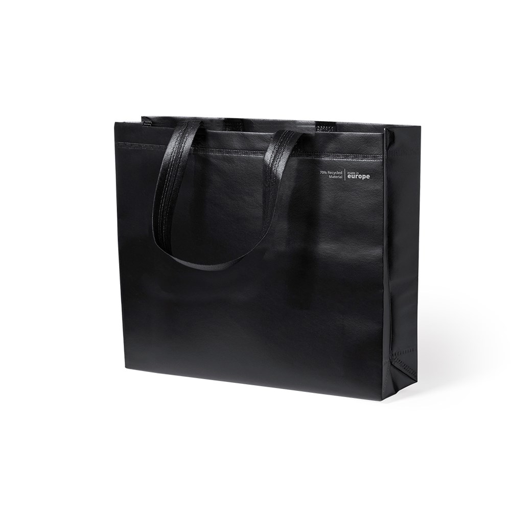 Nature line bag, made of 120g/m2 recycled non-woven with lamination. Made in Europe, with heat-sealed finish, gusset, long handles and eco/made emblem on the bag.