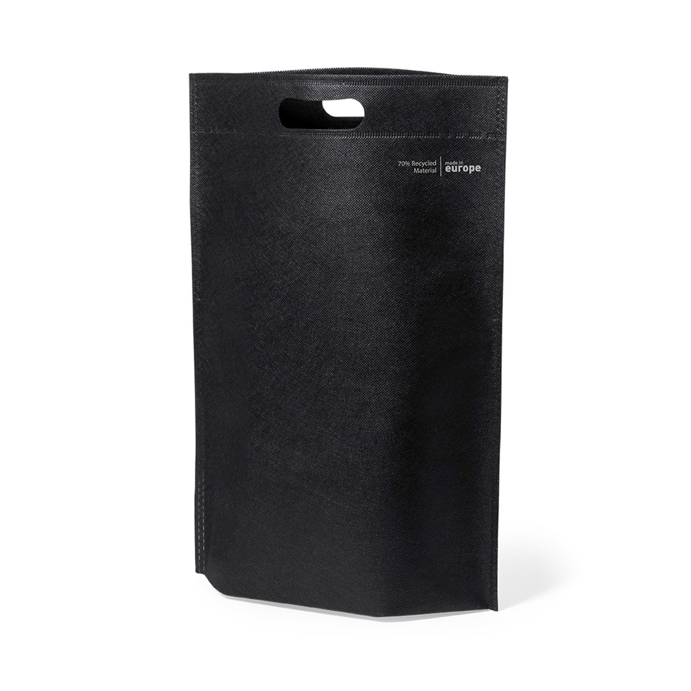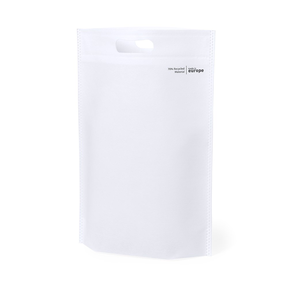 Nature line bag, made of 70g/m2 recycled non-woven. Made in Europe, with heat-sealed finish, gusset at the base, reinforced die-cut handle and eco/made emblem on the bag.