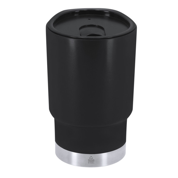 Insulated mug with 380 ml capacity. Made of durable recycled PP with double wall, combined with a base in recycled stainless steel. Lid with easy-open dispenser, BPA-free. Perfect for your desk, table, or any surface where you can enjoy your favourite drink at ease. With Food Grade certification, ensuring safety when in contact with food. Includes recycled stainless steel emblem. Recycled PP is a recycled and highly recyclable plastic, highly resistant and suitable for multiple applications. Steel is one of the most in-demand materials and can be found almost everywhere, from everyday products to large constructions. With countless properties, particularly durability and its high level of reusability, it has become a highly valued alternative in sustainable solutions. When properly treated, it provides new resources with infinite use.