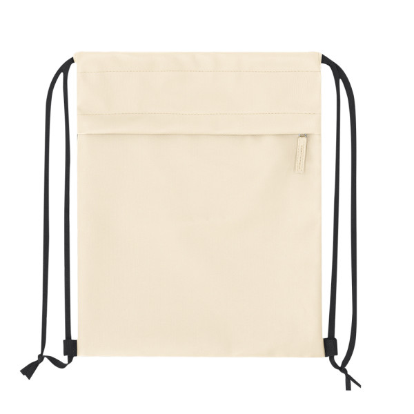 Drawstring backpack made of soft PU combined with durable 600D polyester. Features a functional front pocket with zipper closure and matching PU puller.