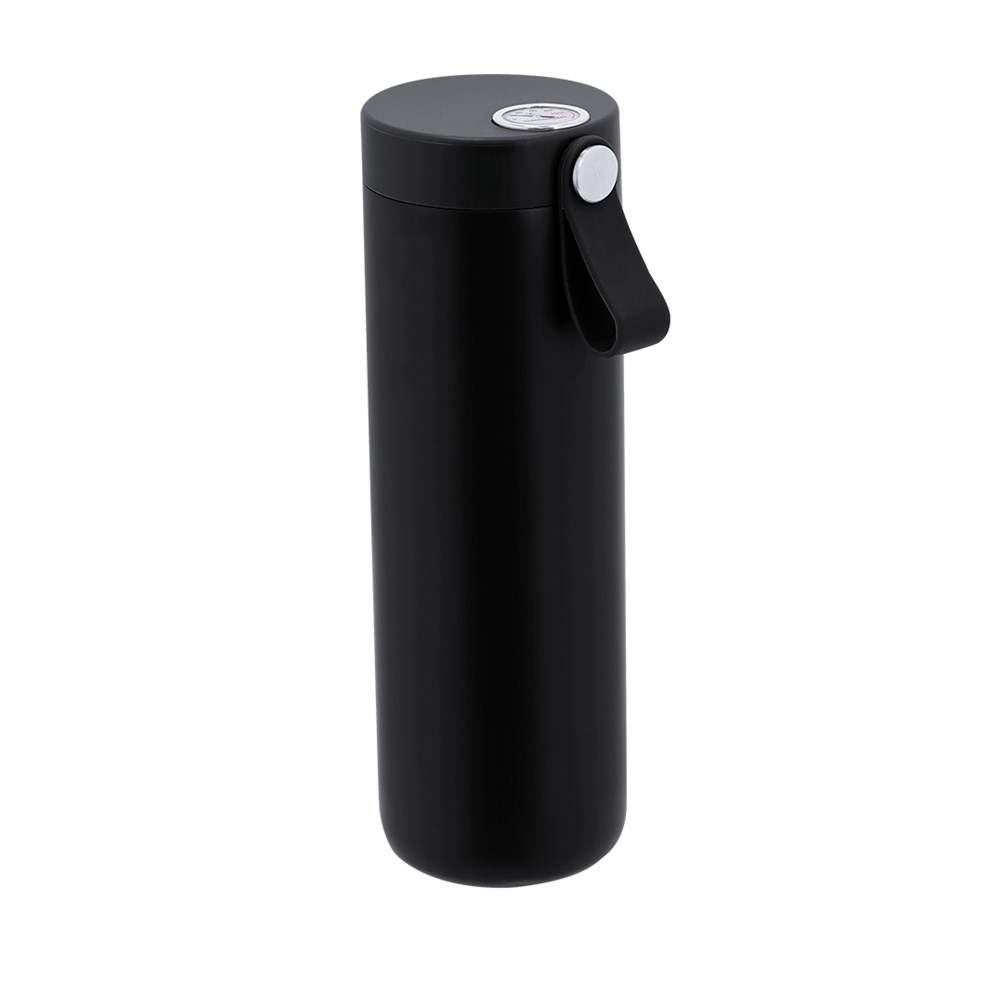 Thermal bottle made of stainless steel and double-walled with a capacity of 500 ml, with an analog temperature gauge, ranging from 0º to 100º. With a safety cap, integrated silicone handle, and matching body. BPA-free.