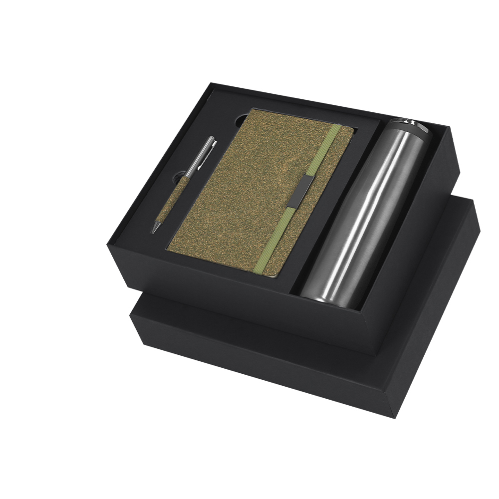 Set of notepad and pen made from Tea Fiber, along with an insulated bottle made from stainless steel.The set includes:- Notepad with hard covers, containing 80 lined pages, elastic band with metal clip, and matching bookmark.- Aluminum ballpoint pen with a chrome finish and Tea Fiber grip, rotary mechanism, and blue ink. - Thermal bottle double-walled made from stainless steel with a capacity of 500ml. Includes a screw cap and metal handle.Notepad with the Tea Grounds logo marked on the back. Presented elegantly in a black box with an interior insert.Tea Grounds is a sustainable material created from recycled tea leaf waste. During the tea processing, the scraps are collected and compacted to give them a second life as a useful resource. Its production promotes the circular economy and reduces environmental impact.