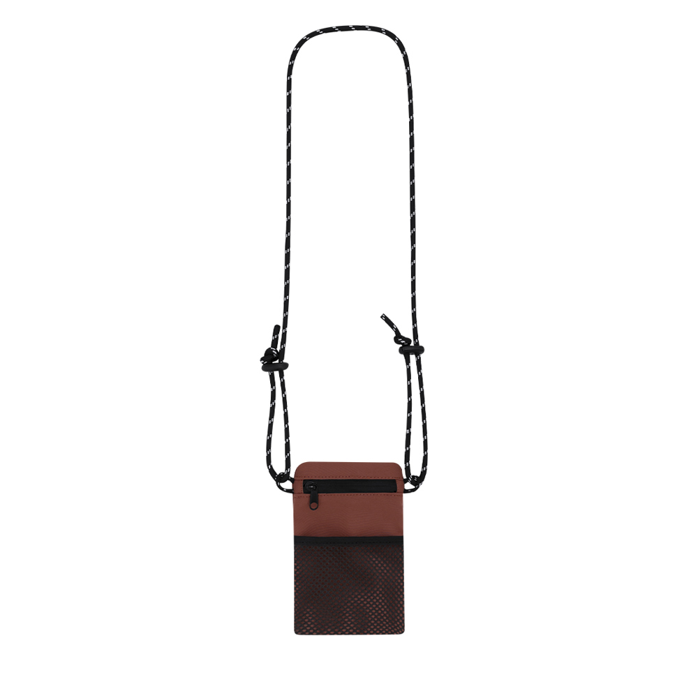 Pouch made from soft 150D polyester. Main compartment with an invisible zipper closure in black and an open front mesh pocket. Includes an adjustable shoulder strap in black and white cord.