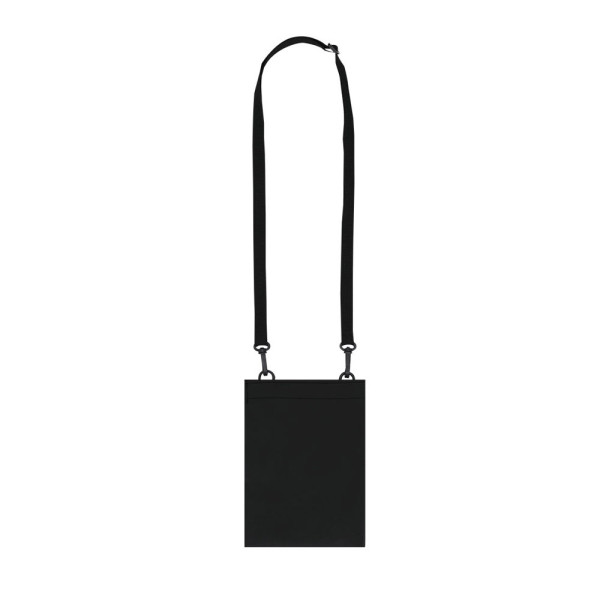 Pouch made from soft PU. Main compartment with velcro closure and wide entry with expandable gusset. Includes adjustable flat strap with double swivel hook fasteners.