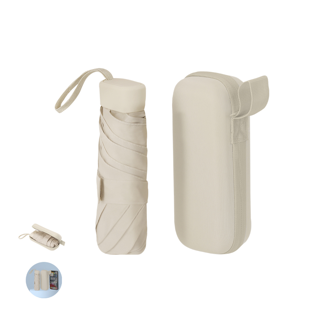 Foldable umbrella with a diameter of 90 cm made from 190T polyester with 6 panels. With manual opening, windproof system, and fiberglass ribs. Compact handle and matching strap. Presented in a rigid transport case made from PU with zipper closure and matching strap.