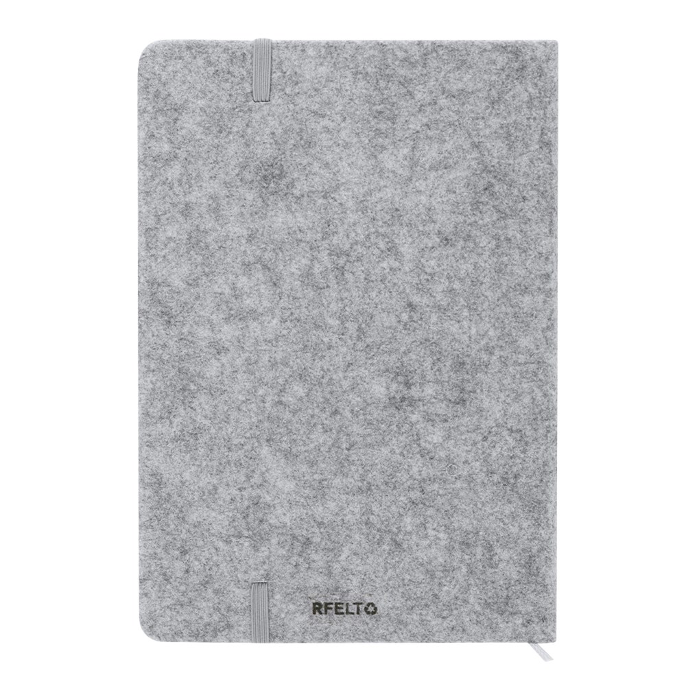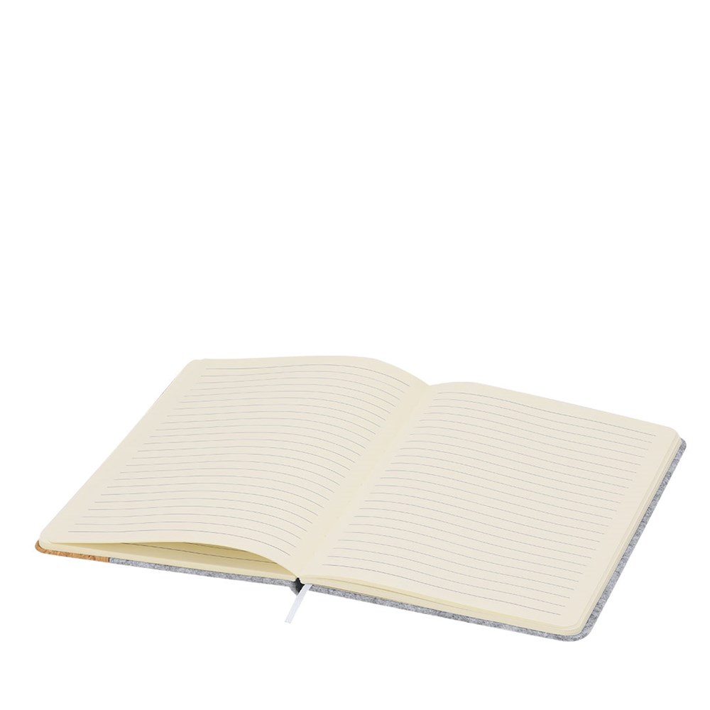 Notebook with hard covers made of a combination of RPET felt and cork. Includes 80 lined sheets with an elastic holder for pens on the cover, elastic closure band, and matching bookmark. Includes RFELT label.Made with plant-based materials to promote the use of natural raw materials and reduce pollutant emissions.RPET felt is the result of combining the recycling process of plastic materials with the ancient technique of felt manufacturing, resulting in an eco-trending material that, besides being recycled, is also recyclable.
