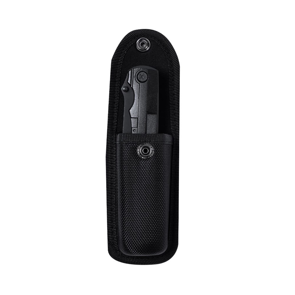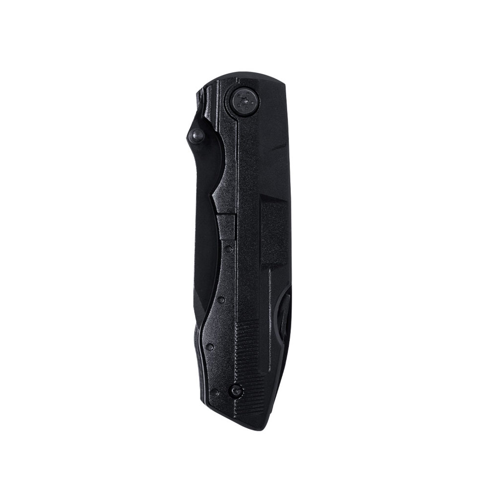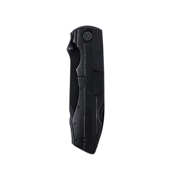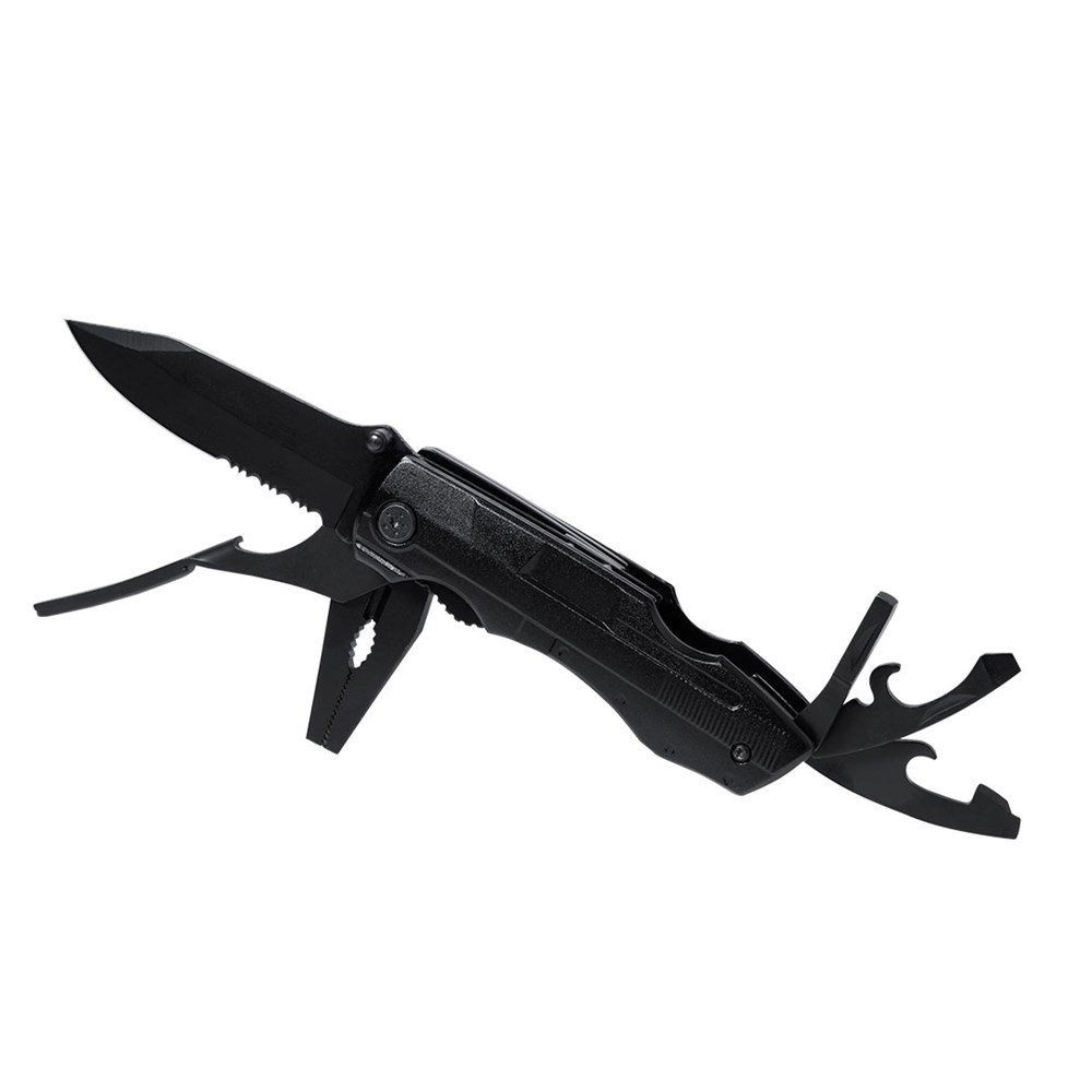 Multi-purpose knife with a black finish in stainless steel and a sturdy matching aluminum handle. Compact folding design. Includes 10 functions:- Screwdriver with multiple heads- Smooth and serrated knife- Bottle opener- Can opener- Pliers with wire cutterPresented in a practical polyester case matching the belt accessory.