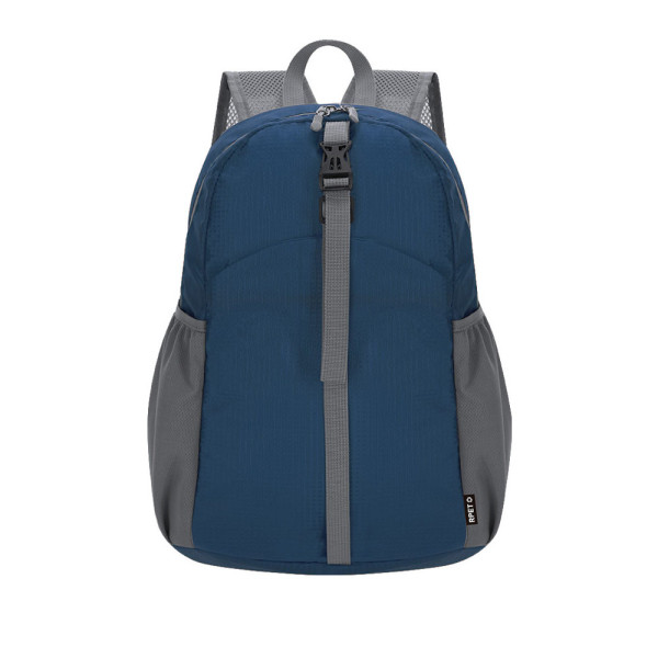 Foldable backpack made of soft RPET Ripstop 210D polyester. Main pocket with double drawstring closure, dual-function inner pocket, and front pocket with clip closure. Reinforced corners with mesh, adjustable shoulder straps, and gray accessories. Small size when folded, with a transport handle. RPET emblem on the tag.RPET material is made from recycled plastic, promoting the reuse of plastic waste and helping to sustain the planet.
