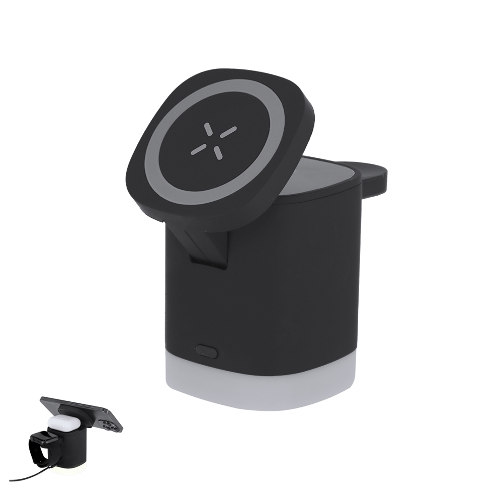 Magnetic 3-in-1 wireless charger with 15W, made from recycled ABS (RABS). Designed for the simultaneous charging of a smartphone, headphones, and smartwatch.It has a built-in lamp in the base with 2 adjustable light modes in white.Type C cable included. An all-in-one gadget: foldable, portable, versatile, and with functional design.The RABS is a highly recyclable plastic that offers great resistance and a multitude of applications that make it an eco-friendly solution.Manufactured according to RoHS standards and complies with the following safety requirements:Overheating protection system.Overload protection system.Locking system to prevent short circuits.